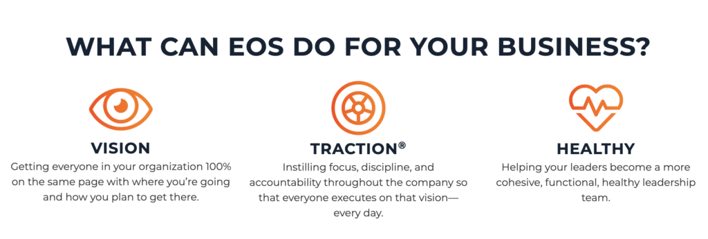 EOS provides a robust framework that empowers organizations to achieve Traction™, consistently executing on their goals and breaking through growth ceilings. It helps align every person to a common purpose, optimize processes for maximum efficiency, and leverage data for smarter decision-making. The result is a more focused, disciplined, and accountable organization that operates with greater harmony and effectiveness. This proven “people operating system” is designed to unlock your team’s full potential, leading to sustained profitability and a healthier work environment.